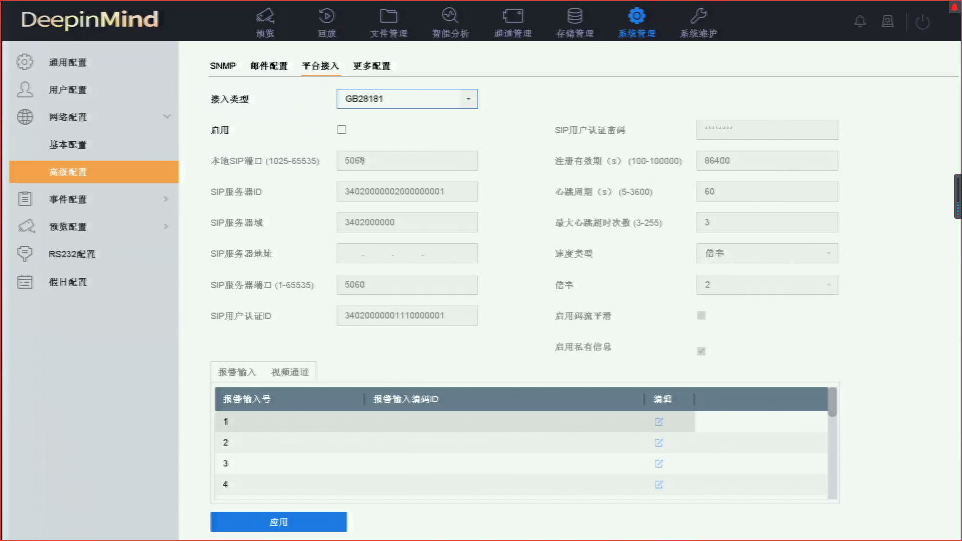 進(jìn)入系統(tǒng)管理→網(wǎng)絡(luò)配置→高級(jí)配置界面,接入類(lèi)型選擇“GB28181”,勾選“啟用”,根據(jù)平臺(tái)提供的信息對(duì)平臺(tái)參數(shù)和設(shè)備通道參數(shù)進(jìn)行設(shè)置(GB28181對(duì)接設(shè)置參數(shù)說(shuō)明見(jiàn)文末),點(diǎn)擊“應(yīng)用”保存設(shè)置。